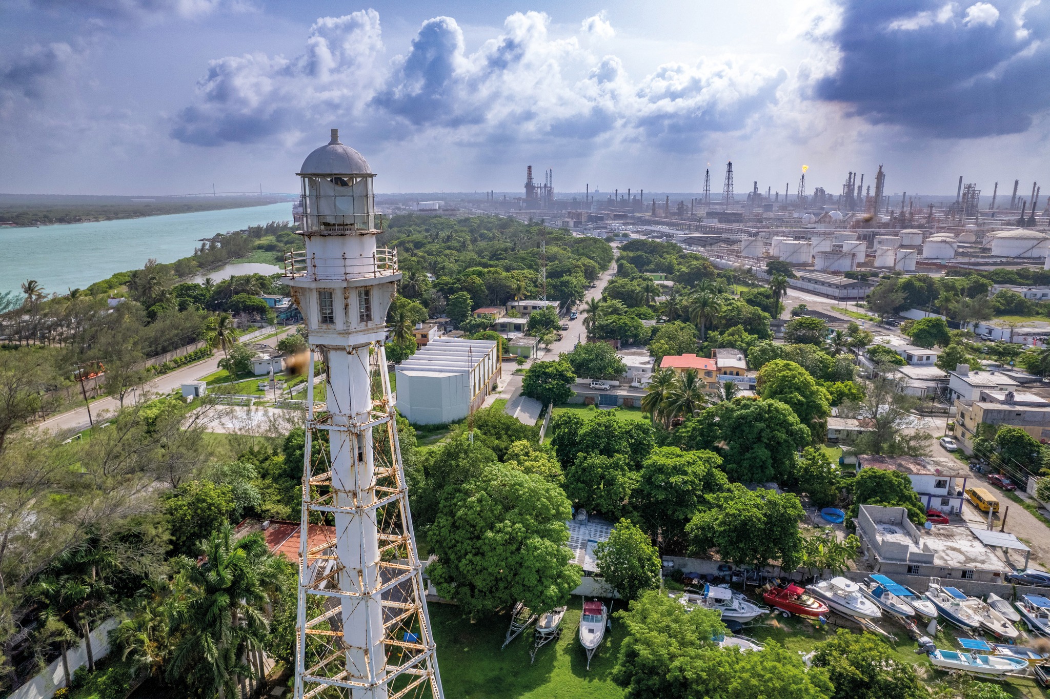 La estructura que se eleva a 43 metros de altura sirve como guía para los buques que ingresan por el río Pánuco al Puerto de Tampico y a la Terminal de Pemex.